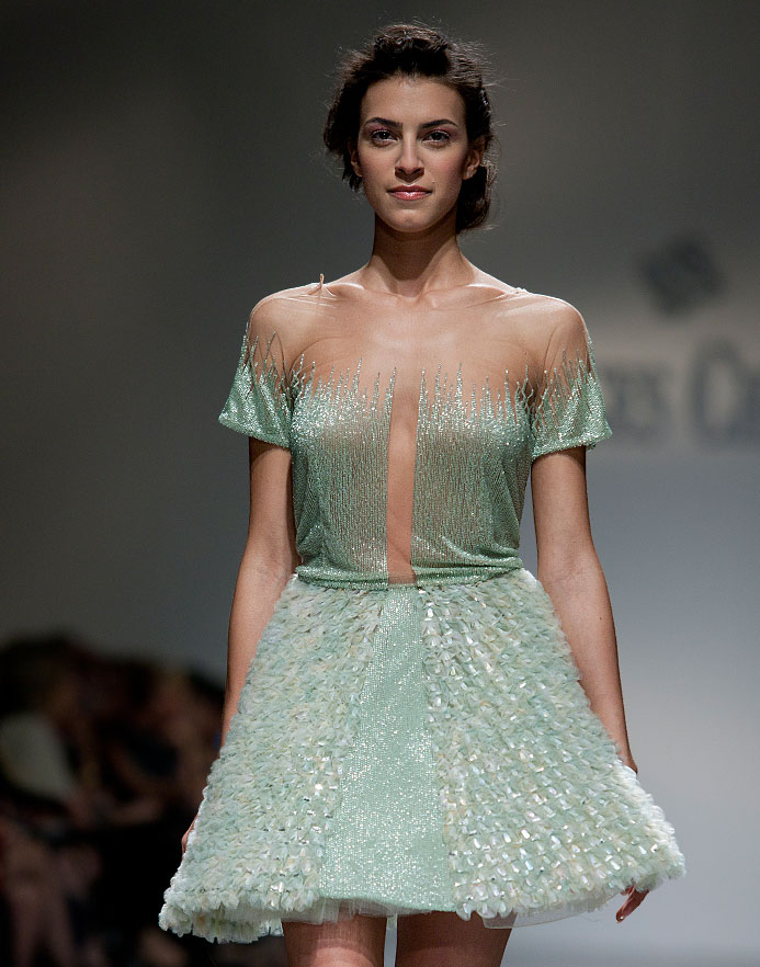 هادئة منظمة، هي تصاميم المصمم جاك كيسّو الرقيقة التي أدهشت الموسم بقصات ناعمة وانسيابية، وألوان مأخوذة من سحر الموسم وجماليته، لتنسج من ألوان قوس القزح لغة غزلية خاصة اتسمت بالأناقة والرقي، فتركت نسمات ربيعية في فضاءات روما التي استقبلت عرض المصمم ضمن أسبوع الموضة في العاصمة الايطالية لأزياء الهوت كوتور. المجموعة التي خصصت لموسم ربيع وصيف 2012، راعى فيها المصمم جاك كيسو فنون التصميم المنظم، عبر إستلهام الزاوية من المثلث الهندسي، لتدخل في نسيج الفساتين على شكل زينة وتطريز من روح الفستان نفسه، ورُسم بطريقة راقية وفاتنة في مواقع مختلفة من الفساتين، تراوحت بين الأكتاف والخصر والصدر، وهي تقنية فريدة، تضفي على الفساتين طابعاً فريداً... كما راعى المصمم جاك كيسو فنون التطريز المبتكرة، مبتعداً عن فنون التطريز التقليدي المتمثل بالأحجار الكريمة والكريستال، متجهاً الى التطريز الناعم والرقيق الذي ولد من روح القماش نفسه نافراً بأشكال صغيرة، مثل ورود ربيعية وأوراق شجر ربيعي رهيف. وبدت المجموعة منسجمة ببعدين فنيين أساسيين: وحدة الموديل، حيث طغت قصّة حورية البحر على التصاميم، من خلال التصاقها بالجسم، وضيقها في الأعلى واتساعها بطريقة انسيابية في الأسفل. ويمكن وصف القصّات بأنها مثيرة، اذ اتسمت بجرأة راقية تبرز التفاصيل الأنثوية في جسم المرأة، وتلفت الأنظار الى سحر مشرق من ثنايا التصاميم. أما البعد الثاني فيتمثل بنوع القماش حيث طغى قماش التول على مجمل التصاميم، من غير أن يكون هو القماش الوحيد المستخدم. وبرز التول ساحراً ومختلفاً من خلال التطريز الذي شغل مكانته بطريقة مبتكرة، متميزاً هذا القماش بلمعيته الخفيفة، ورقيّه في التعبير عن انوثة المرأة وأناقتها. خرج المصمم جاك كيسو بفستانا الزفاف من التصميم التقليدي، حيث خليا من التطريز البرّاق، واتسما بتطريز طبيعي بسيط يلاقي الربيع برقته وعذوبيته، ولا يمكن الا القول انهما مأخوذان من عالم الأساطير الجمالية، ويلاقيا مختلف فساتين المجموعة على مروحة من الألوان الحالمة تحاور بجماليتها قوس القزح. |
