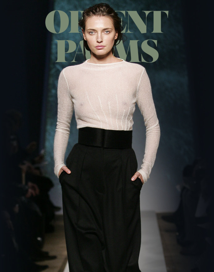 Taupe cashmere wrap-over top, molded with folds, embroidered with feathers
